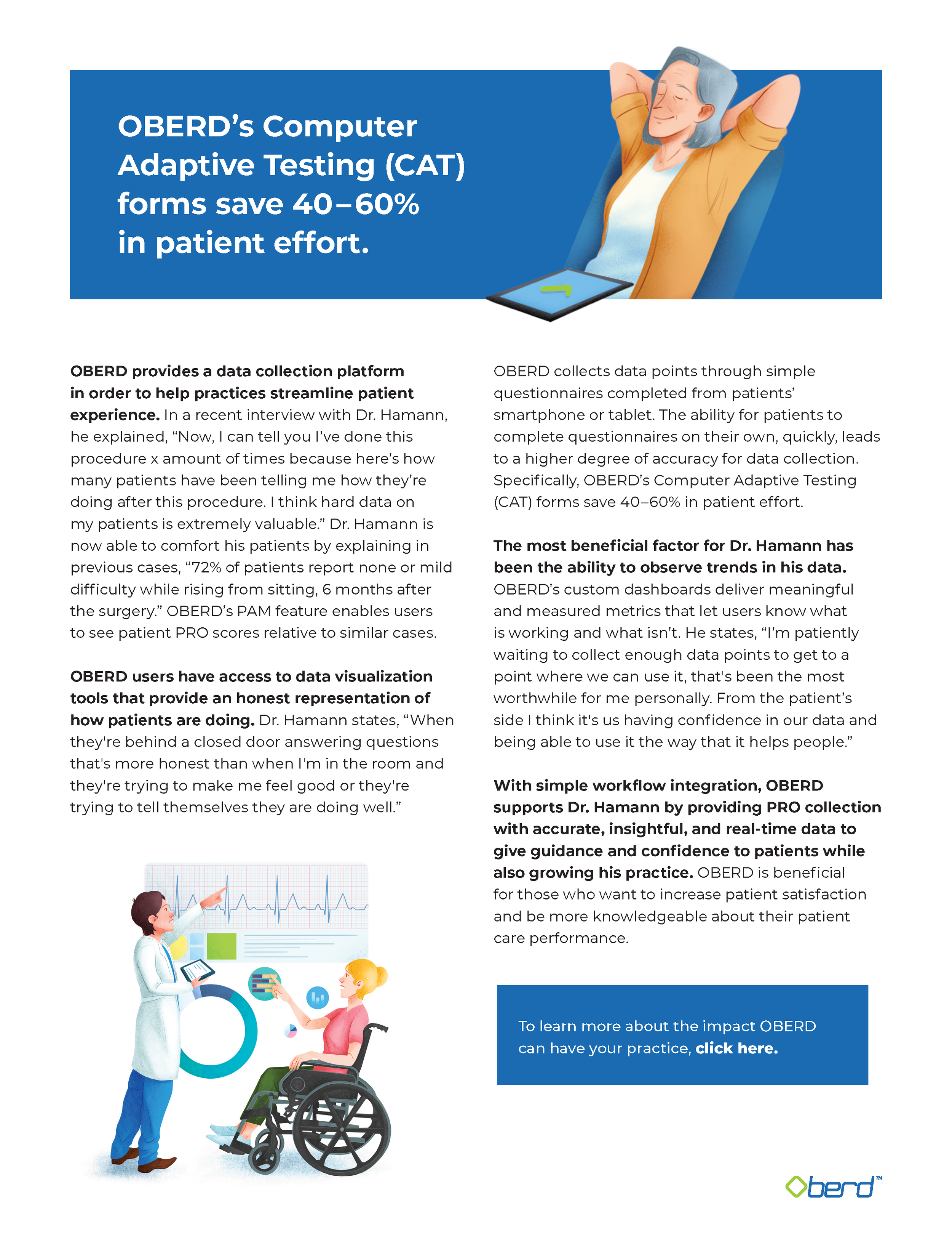 OBERD (Universal Research Solutions, LLC) is a Columbia, Missouri-based healthcare technology company that provides a web-based platform for collecting and analyzing patient-reported outcomes (PROs) and clinical data. Primarily focused on orthopedics for over 13 years, the HIPAA and HITRUST-compliant software allows patients to complete questionnaires electronically, assisting care teams in measuring recovery and improving clinical decision-making.